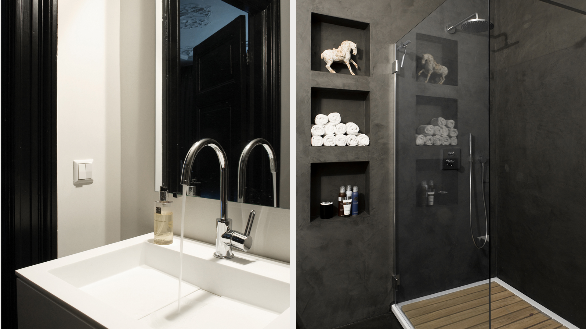 Choc Studio designed an interior where classical and modern elements enhance one another. The black-oiled herringbone floor forms a strong foundation. In the bathroom, tadelakt was chosen for its timeless texture, while the bedroom ceiling was finished with French wallpaper for a Baroque touch. A chandelier provides a sense of grandeur, all without compromising modern-day comfort.