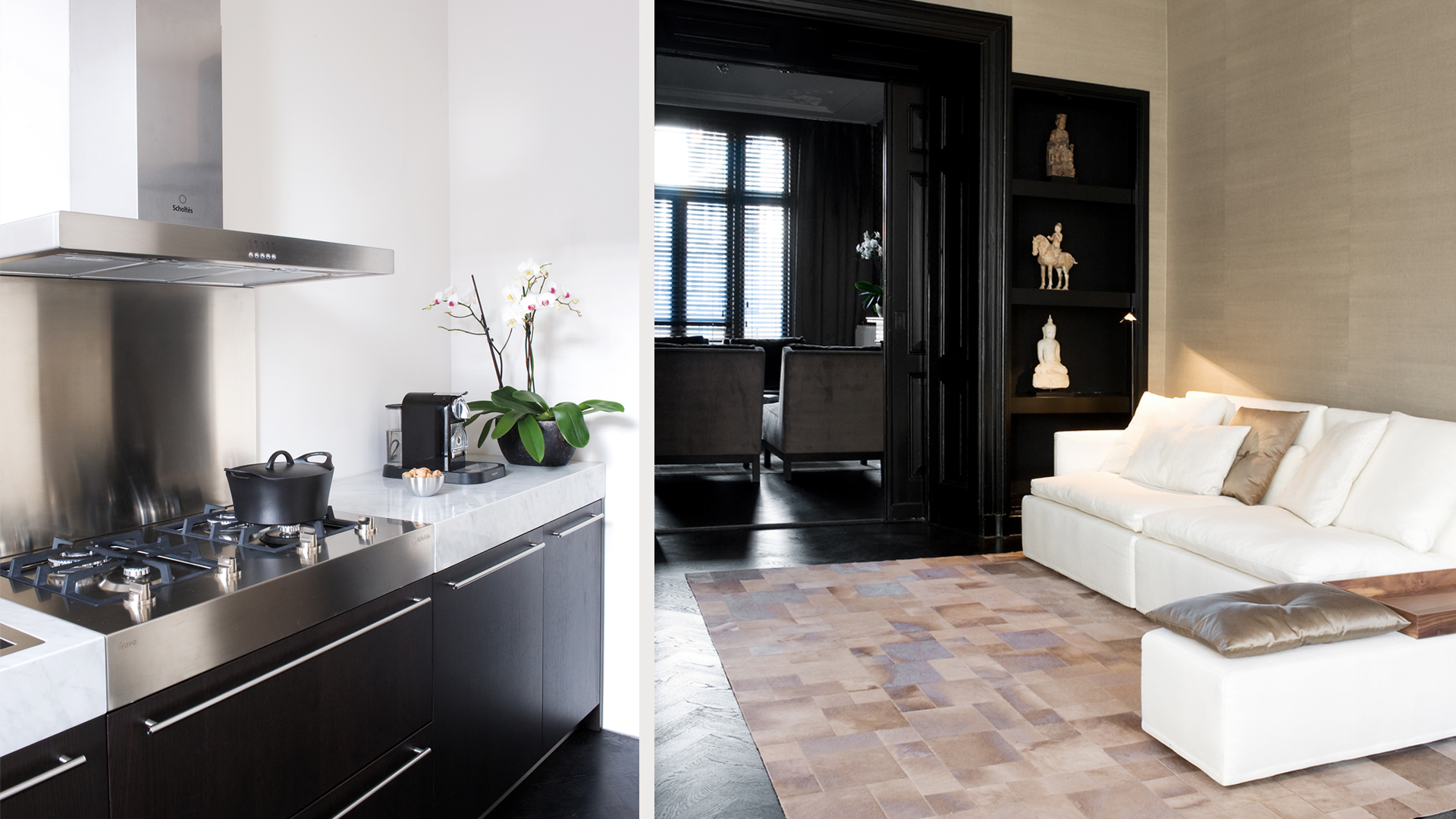The apartment is furnished with designer furniture by Frigerio, Pure Choc and Gelderland. Leather rugs by Miyabi Casa and sisal wallpaper by Arte add texture and warmth. Fabrics by Zinc and lighting by Piet Boon, Tom Dixon, Frigerio and Fabbian enhance the desired atmosphere. The kitchen by Italian brand Arclinea completes the look. This created a pied-à-terre in which classic stylistic features and modern chic come together harmoniously.
